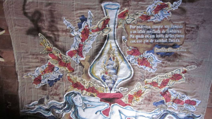 Explicó Ríos que elementos del entorno más familiar de la poeta como los gatos y las flores se incluyen en la composición visual; predomina el púrpura por uno de los versos de la estrofa que reza: Por poderosa sangre voy llamada/ a un latido constante de temblores./ He quedo en esa huida de las flores/ en ese fin de soledad tocada.
