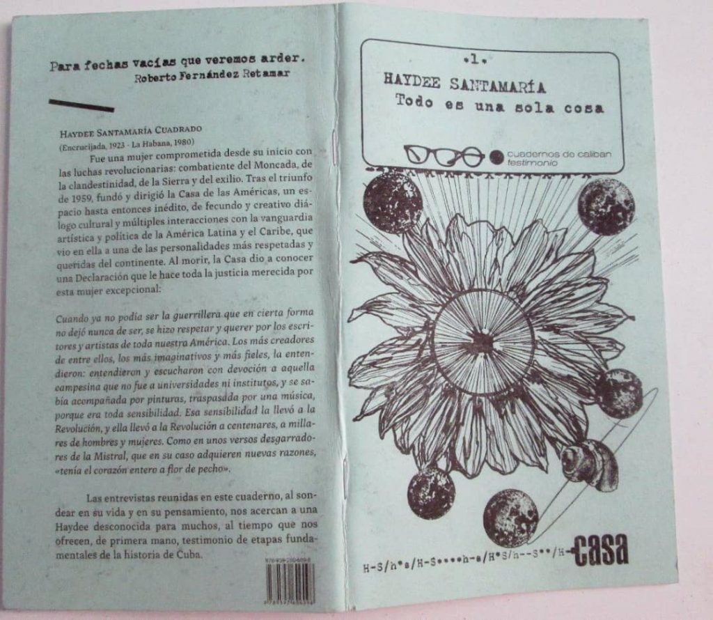 En la contracubierta del cuaderno, aparece un fragmento de la Declaración que emitió esa institución al morir Haydee, y que está asociado a su imprescindible papel al frente de la Casa, como promotora de la literatura y las ideas más progresistas del continente y como puente entre estas y los escritores consagrados y noveles del mismo con Cuba: