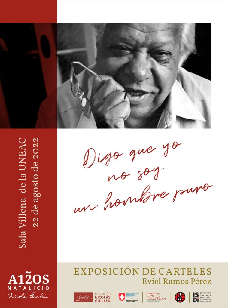 Lo hace bajo el legado de su Presidente Fundador, el Poeta Nacional Nicolás Guillén, en el 120 aniversario de su natalicio. Con el auspicio de la Fundación que lleva su nombre quedará inaugurada hoy lunes, a las 4.30 de la tarde en la sala Villena, la muestra de carteles “Digo que no soy un hombre puro”, del creador Eviel Ramos Pérez.