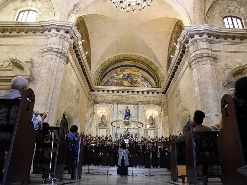 El imponente templo católico de estilo barroco presente en la Catedral de La Habana, en la zona más antigua de la ciudad, acogió al Coro Nacional de Cuba, el cual se presentó durante la primera parte con un amplio repertorio que incluyó «Unicornio», de Silvio Rodríguez, y «Ausencia», de Liuba María Hevia, con la intervención de Ivette Cepeda.