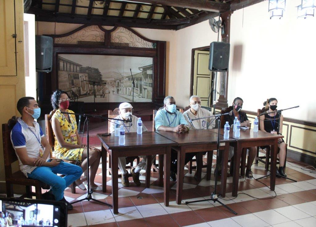 De izquierda a derecha: Yoricel Andino, Coordinadora Evento Teórico; Alejandro Almenares, Trovador; Raulicer García, Director Provincial de Cultura; Rodulfo Vaillant, Presidente de la UNEAC y Directivos de la Empresa de la Música. /Foto del autor