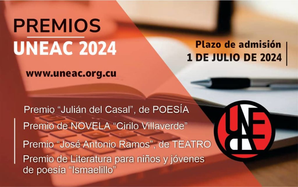 La Asociación de Escritores de la UNEAC, con el propósito de estimular la creación literaria en el país, convoca a los Premios UNEAC 2024, en los géneros de poesía con el galardón “Julián del Casal”; de novela con el “Cirilo Villaverde”; de teatro con “José Antonio Ramos” y el reconocido “Ismaelillo”, correspondiente a la literatura para niños y jóvenes.