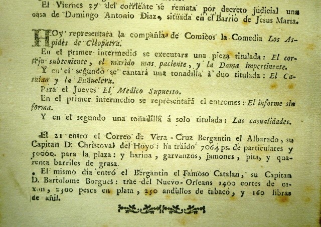 Revisé los diez números correspondientes a 1790: en solo seis, se anuncian veintitrés obras en doce días de función. En la cuarta página de aquel primer número, se publica la cartelera teatral de esa noche y la del próximo jueves 28: