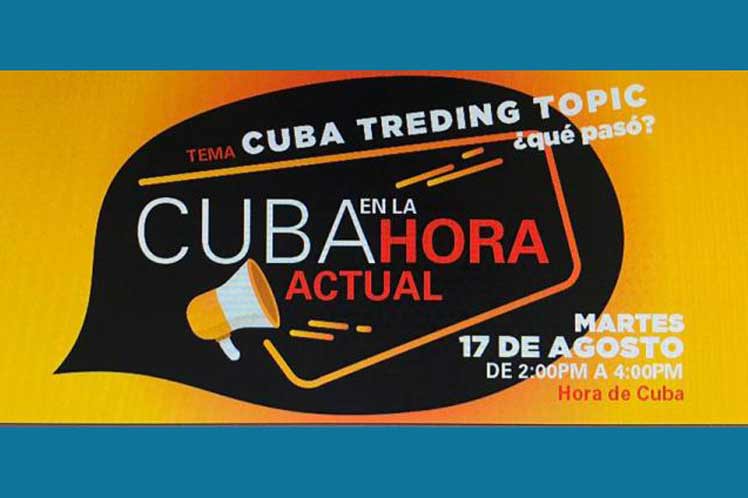 Con el título Cuba Trending Topic: ¿qué pasó?, arrancará la primera sesión, correspondiente al próximo martes 17 de agosto y, se dedicará a explicar los hechos ocurridos durante los llamados «disturbios sociales» y los antecedentes, causas e instigadores de la operación política-comunicacional contra la Revolución Cubana. Como panelistas participarán Rosa Miriam Elizalde (Cuba), vicepresidenta primera de la Unión de Periodistas de Cuba; Pedro Santander Molina (Chile), profesor de la Pontificia Universidad Católica de Valparaíso; José Ernesto Nováez (Cuba), coordinador del Capítulo Cubano de la Red En Defensa de la Humanidad; Helen Yaffe (Reino Unido), profesora de la Universidad de Glasgow; Txema Sánchez (España), comunicador, conductor del canal antimperialista TECs Tertulias en Cuarentena e integrante de la Red EDH.