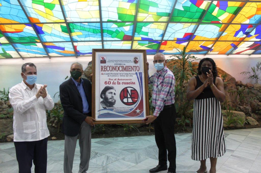 Por la emotiva ocasión, el Primer Secretario del Partido en la provincia, José Ramón Monteagudo Ruíz, y la Gobernadora Beatriz Jhonson Urrutía, integrante del Consejo de Estado, entregaron un reconocimiento especial a la UNEAC de Santiago de Cuba, un momento que estuvo antecedido por las palabras del compositor Rodulfo Vaillant, su Presidente en este sur-oriental territorio, que ratificó el compromiso de la vanguardia artística de esta parte del país con la nación.