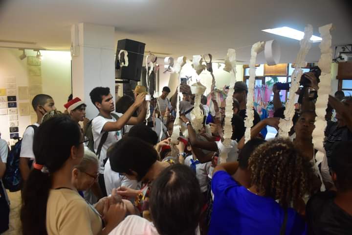 Integrantes de la Asociación de Artistas de Artes Plásticas de la UNEAC y estudiantes de escuelas de la comunidad intercambiaron con integrantes de este proyecto, que según refiere Chloe Paré “está dirigido a grupos y comunidades vulnerables con poco acceso a los espacios del arte contemporáneo, a quienes convierte en creadores activos de una propuesta colectiva, al tiempo que los familiariza con la dinámica creativa de la Bienal”.
