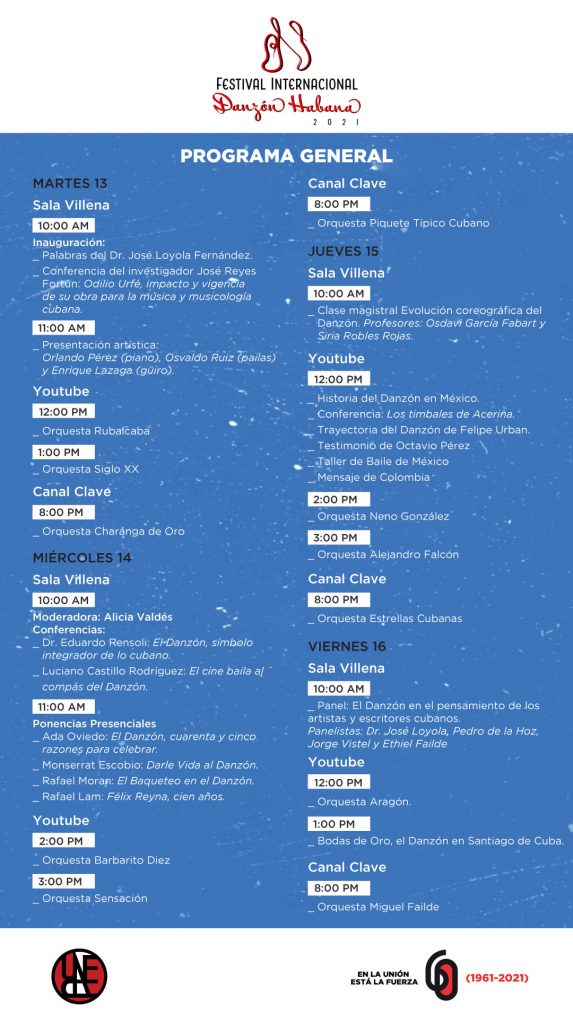 El evento, que se desarrolla esta vez desde las plataformas digitales, rinde homenaje también a los centenarios de los destacados músicos y compositores Odilio Urfé y Félix Reina; al Aniversario 95 del natalicio de Enrique Jorrín; a los 110 años del natalicio de Arcaño; al Aniversario 145 del natalicio de Antonio María Romeu y al 45 de la fundación de los Clubes de Aficionados de Amigos del Danzón.