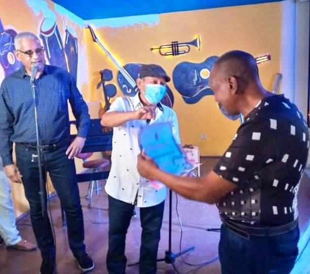 De izquierda a derecha: Gerardo Houdayer, vicepresidente primero de la UNEAC santiaguera, Rolando Maceda, realizador de televisión, entrega reconocimiento a Francisco Medina / Foto del autor