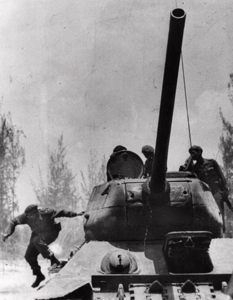 Fidel Castro salta desde el tanque que lo llevaba hasta Girón, cerca de Bahía de Cochinos, escenario de la invasión de la Brigada de Asalto 2506