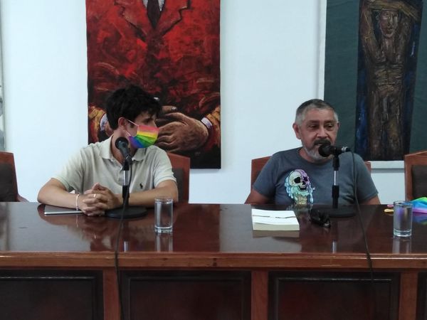 De izquierda a derecha el escritor cubano Ángel Enrique Melians y el mexicano Luis Aguilar, antologador de Ese Gran reflector encendido de pronto / Foto de Taymi Medina Hernández
