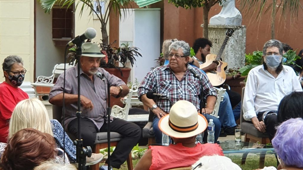 De izquierda a derecha la artista plástica Diana Balboa, el músico Pancho Amat, el trovador Augusto Blanca y Abel Prieto, presidente de Casa de las Américas / Foto del autor