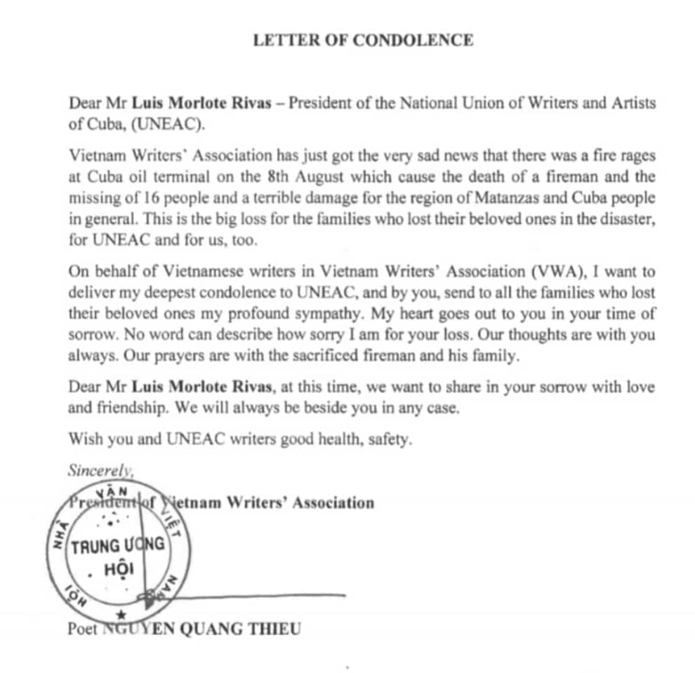 Nguyen Quang Thieu, presidente de la Asociación de Escritores de Vietnam, transmitió en una carta al presidente de la Unión de Escritores y Artistas de Cuba (Uneac), Luis Morlote Rivas, su solidaridad ante el lamentable incendio en la central de supertanqueros de Matanzas y la confianza en los creadores cubanos para contribuir a que “este mal momento pase” y “devolver la sonrisa al pueblo cubano”.